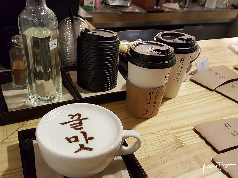 櫃檯前的韓字皆出自老闆之手,不管是在杯套還是咖啡上都是好美啊~