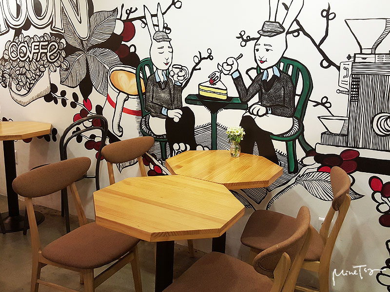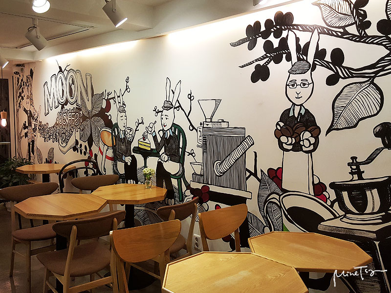 靠著旅伴的韓國友人中韓文說明(我們偶爾也跟老闆的韓文對話,但不是完全都懂),原來這大片牆上可不是一般的隨便塗鴉,這是老闆的大作!二隻擬人兔是老闆和老婆大人,老闆很喜歡兔子!右邊戴眼鏡捧著咖啡豆的則是老闆本人!