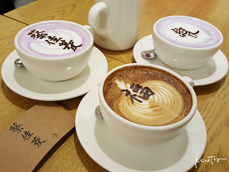 旅伴早在到訪之前已經事先跟約老闆約定好,咖啡上的字和杯套都寫她的名字(已經本人同意上傳),所以只有她的是名字,其他則是由老闆隨意寫上。