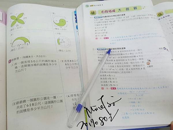現在我卻每天面對這些在當時痛苦萬分的數學題目。左是教了多年的國小數學(此為六上圓面積)、右是國一的科學記號,比學生還認真的算過每一題,卻愛上它!沒想到每天算算國中數學也是動動腦時間,愈算愈有趣!要是年紀小時能夠這麼認真,成績應該會更好!