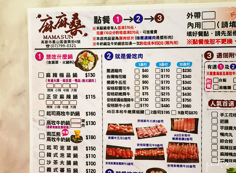 原來點餐有1 -> 2 -> 3的順序,很好理解,難的是,很難選擇!因為每個都想吃但肚子有限!我覺得很不同的是在2的選項裡(有肉品和海鮮),肉品分了三種重量可以選擇,又怕客人很不明白其中差異(我們就是),直接來個實景照,實在太厲害了!淺顯易懂!難的依舊在於好難選擇XD。